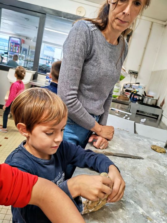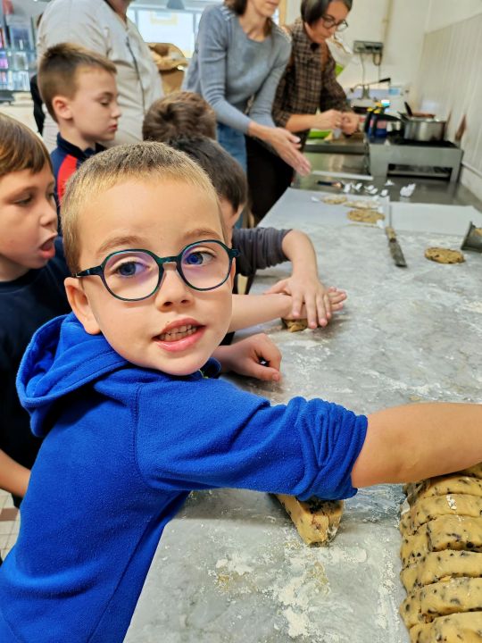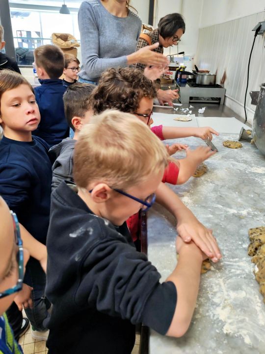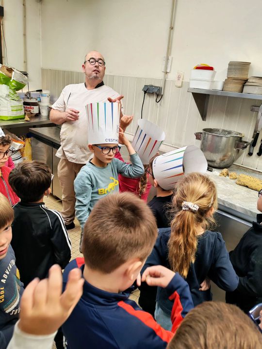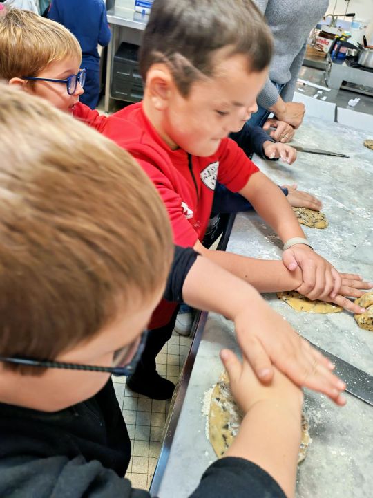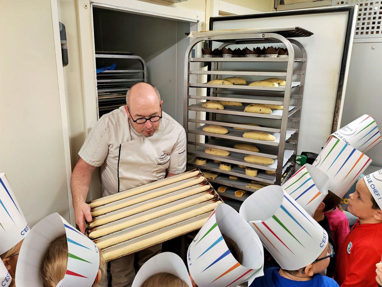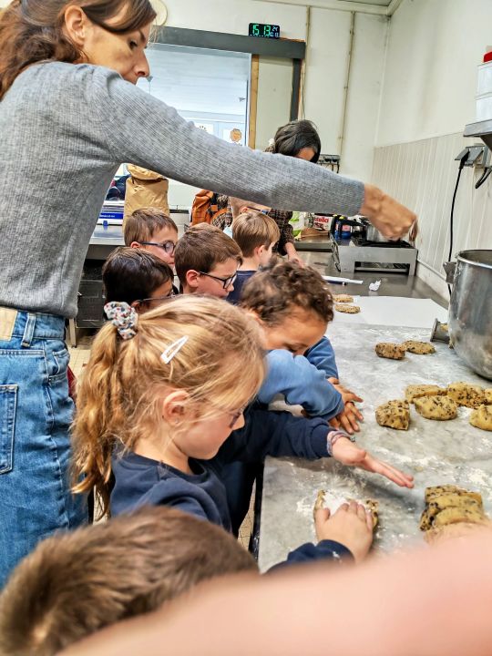 Aujourd'hui les classes de CE1 et CP ont été reçues par Monsieur Guillerm pour visiter son fournil, là où a lieu la fabrication du pain et son laboratoire, là où sont confectionnés les pâtisseries. Les élèves ont découvert les machines utilisées pour les différentes étapes de la fabrication du pain : du pétrin au four en passant par la chambre de pousse. Ensuite, chacun a pu réaliser un gros cookie gourmand. Assez grand pour être partagé !