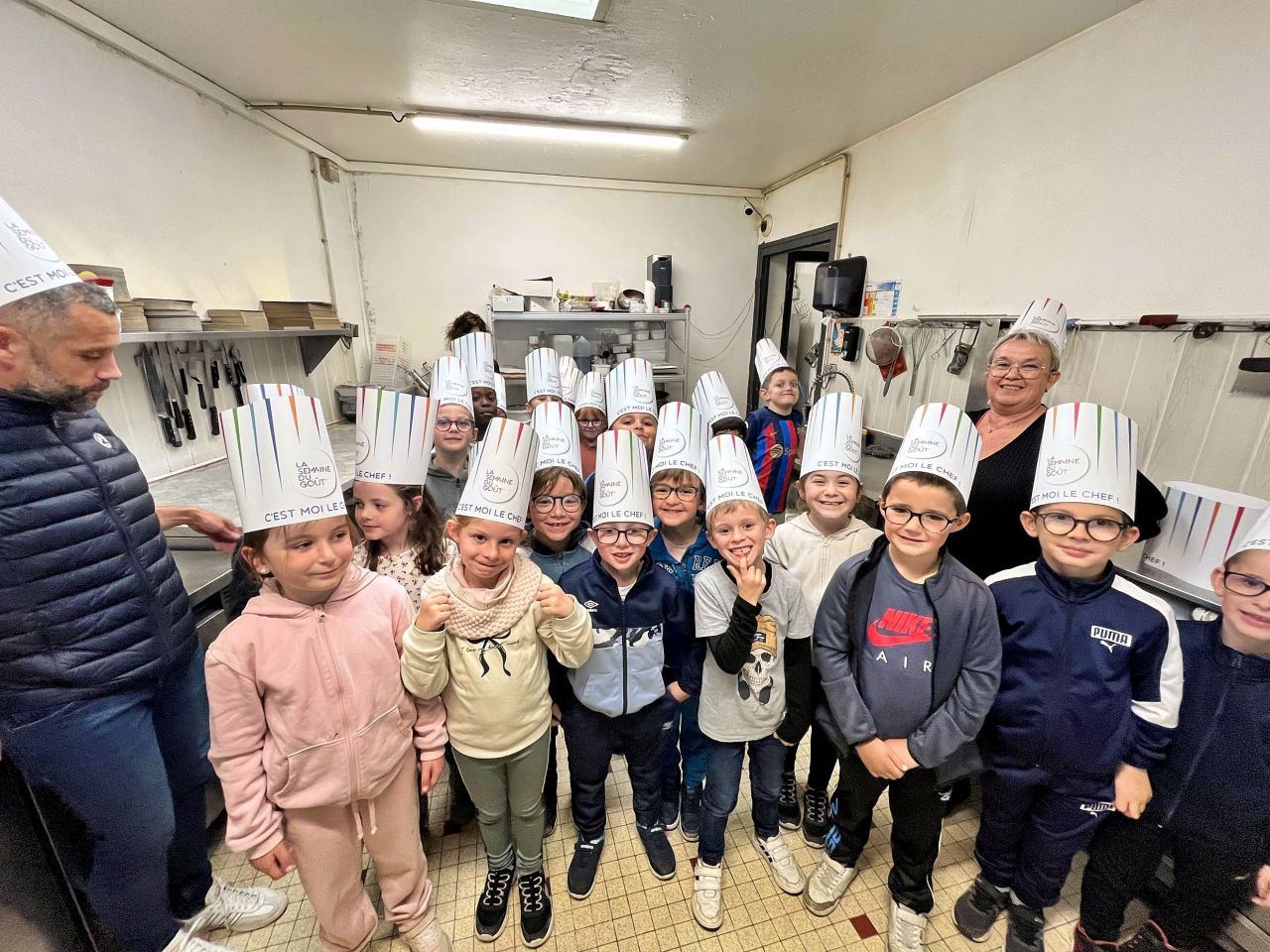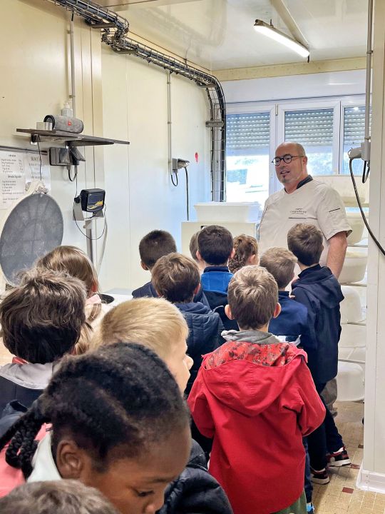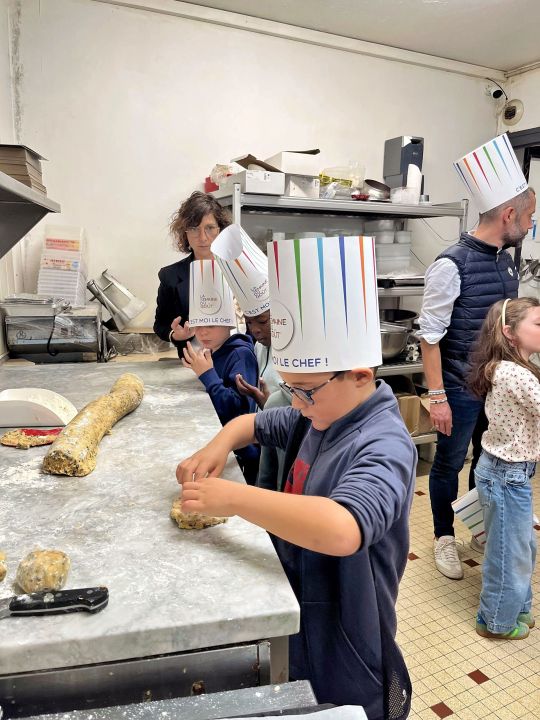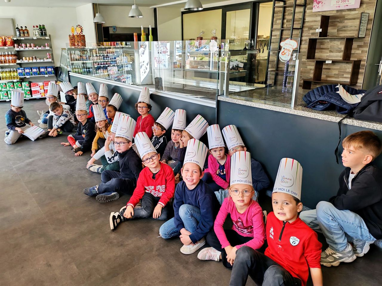 Aujourd'hui les classes de CE1 et CP ont été reçues par Monsieur Guillerm pour visiter son fournil, là où a lieu la fabrication du pain et son laboratoire, là où sont confectionnés les pâtisseries. Les élèves ont découvert les machines utilisées pour les différentes étapes de la fabrication du pain : du pétrin au four en passant par la chambre de pousse. Ensuite, chacun a pu réaliser un gros cookie gourmand. Assez grand pour être partagé !
