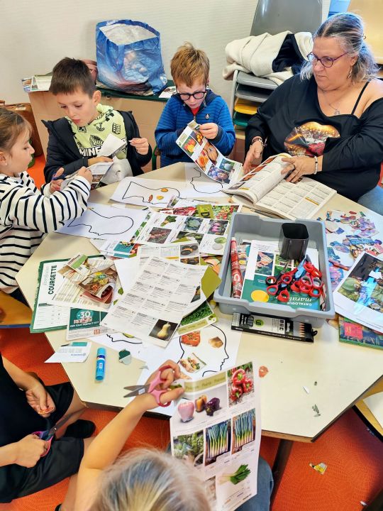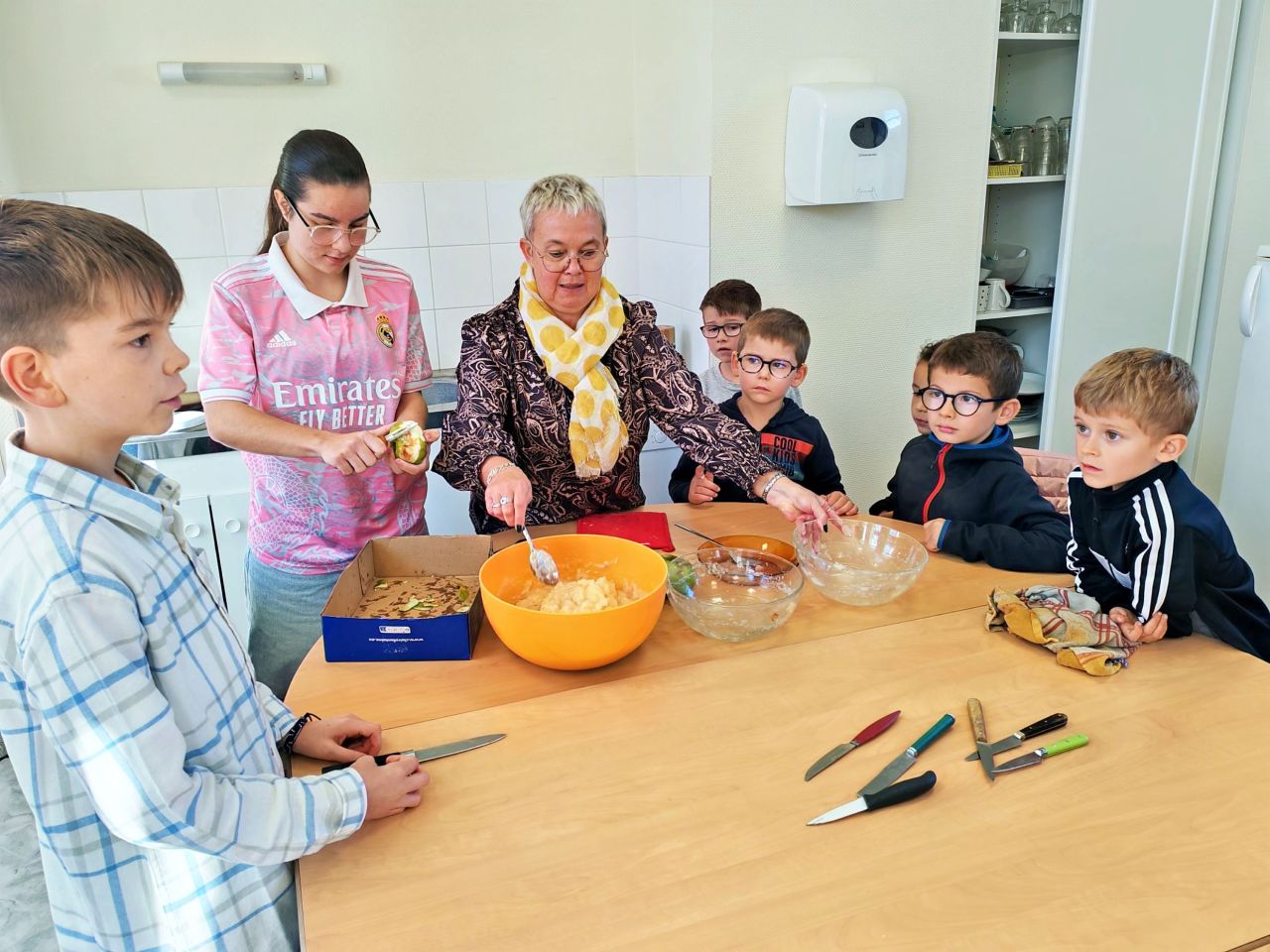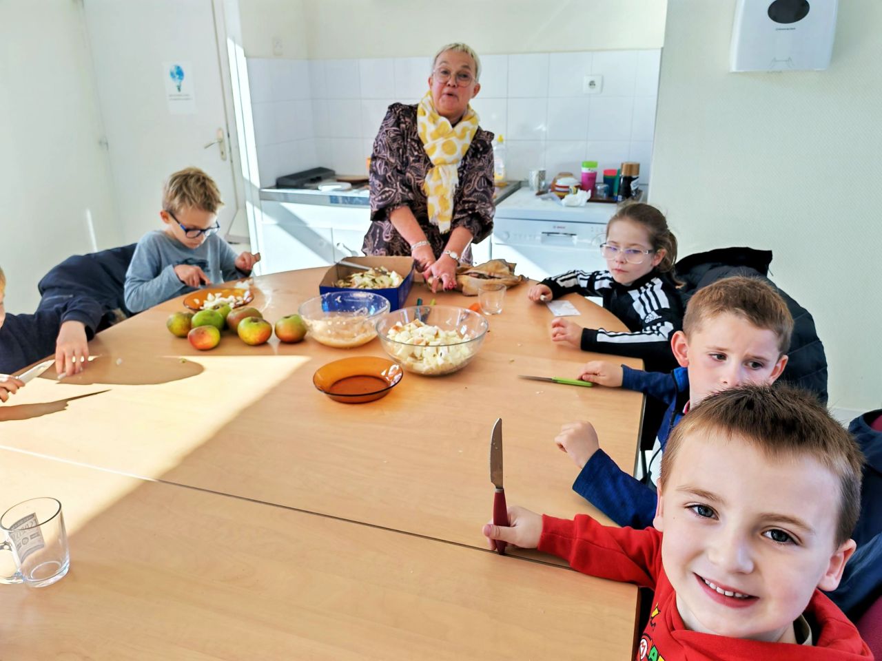 Au programme 8 ateliers : la saisonnalité des fruits et légumes, cookies maison versus cookies industriels, à la manière d'Arcimboldo, jeu du toucher, loto des odeurs, atelier des saveurs et préparation de compote avec les pommes de la cour de récréation !
